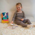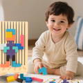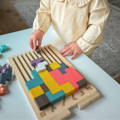 - Montessori Brain Blocks – A wooden pattern board with 42 colorful blocks and 10 double-sided pattern cards. Kids can match the cards or invent their own designs, building logic, focus, and spatial awareness as they fill every space.