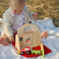 - Montessori Traveling Farm – A portable wooden barn playset filled with farm animals, tractor, fences, and trees. The barn folds into a carrying case so every piece packs neatly inside for easy cleanup and travel.